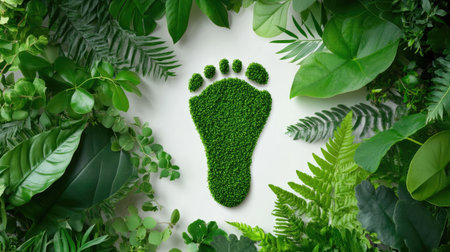 A vibrant eco-friendly footprint made from lush green leaves surrounded by a variety of foliage, symbolizing environmental awareness and sustainability.