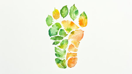 A vibrant footprint made of watercolor leaves in green and orange hues illustrates the bond between nature and human presence, emphasizing environmental consciousness.