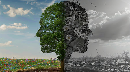 The photo is split in half. In the middle is a tree divided into two profiles of a human head. One half depicts a green fresh tree with foliage, blue sky, beautiful flowers, grass. The second half of the photo is in gray tones. The tree is old and worn out, everything is littered with garbage. environmental pollution