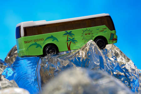 The toy is a garbage truck green with a white body on a yellow background banner with a place for text for a toy store. Children's toys typewriter