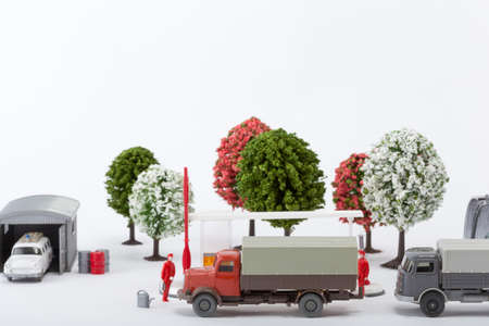 Toy garbage truck with a green garbage can standing on a tree hemp against a blurred forest background. Selective focus, copy space. Clean forest concept.