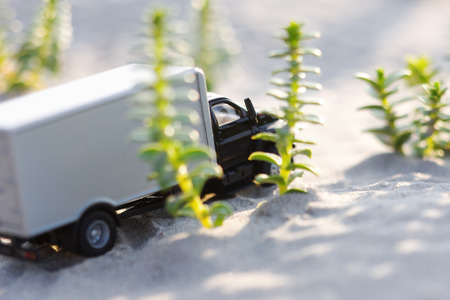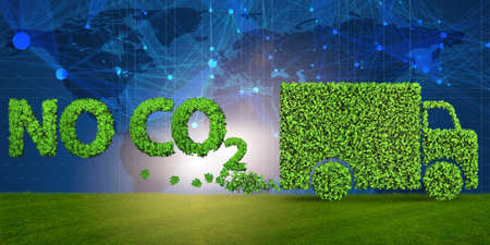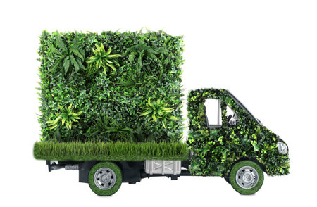 Eco-friendly transportation. Truck covered with green lush grass on white background