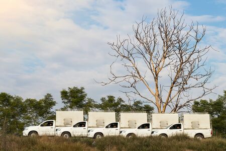 A big white truck was driving on the road. With solar panels and wind turbines in the background.3d, rendering, illustration,