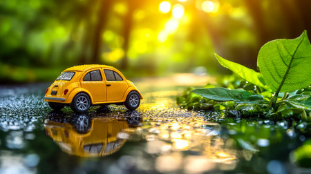 A miniature yellow vehicle delicately rests on lush green leaves, sparkling with tiny water droplets, evoking freshness, playfulness, and nature-inspi