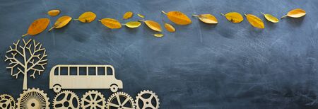 education and back to school concept. Top view photo of school bus over wooden gears as concept of success and achievement and classroom blackboard background
