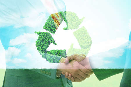Green recycle symbol on increasing coins stacking in front of business man for reduce reuse and recycle can made more company profit concept.
