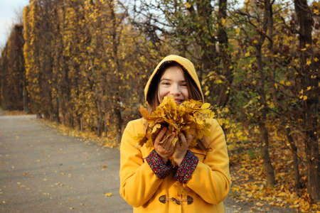 the girl in a yellow hooded coat holds the leaves in her hands autumn season