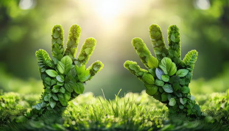 Hands wrap around a strong green tree and a delicate young plant, showcasing a deep connection to nature and environmental responsibility