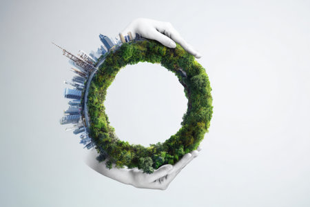 Hands hold circular city and forest. Whitegloved hands cradle miniature ring, human gesture implies stewardship and accountability, studio minimalism focuses attention on sustainable responsibility