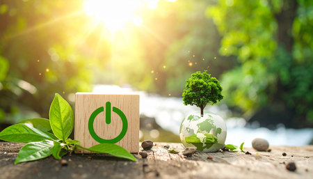 A green textured globe is the central subject of this image, adorned with illustrations representing sustainable energy sources. It is set against a blurred background of green vegetation, suggesting an outdoor environment. The composition conveys environmental consciousness, potentially suitable for eco-friendly or sustainability-themed publications.