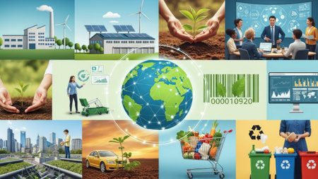 Collage of eco-friendly innovations: renewable energy, urban green spaces, marine conservation, rewilding, smart forestry, and ethical consumption in modern society.