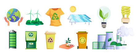 Eco friendly environmental set, collection of globe, windmill, t-shirt, solar panel, light bulb, battery, recycling garbage bin, power plant. Concept of ecology protection. Vector illustration