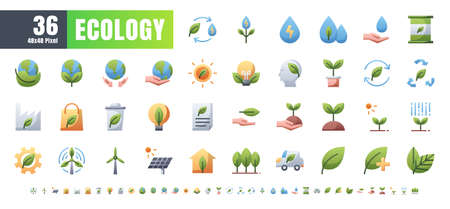 Vector of 36 Ecology and Green Energy Power Gradient Flat Color Icon Set. 48x48 and 192x192 Pixel.