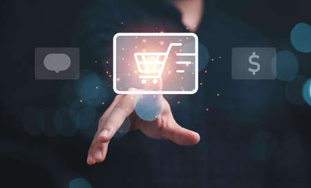 Businessman touching to shopping trolley cart icon for online shopping and e-commerce business concept.