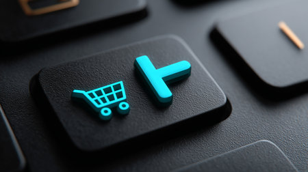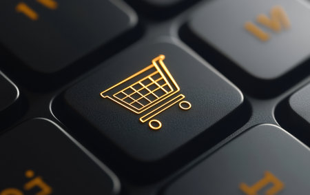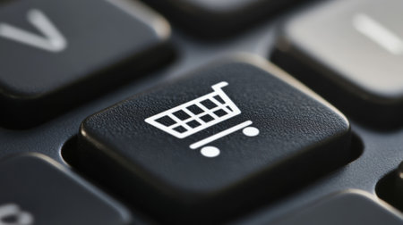 Close up of a black keyboard key featuring a white shopping cart icon, representing the ease and convenience of online shopping and e commerce