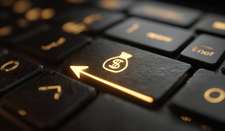 This image features a close-up of a laptop keyboard, focusing on a key with a money bag symbol. The key is illuminated, set against a dark background. The scene suggests a financial concept. The composition and lighting create a modern aesthetic suitable for various commercial uses.