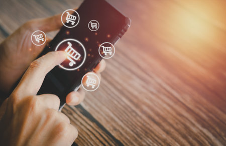 Businessman using mobile or smartphone with shopping cart icons for shopping online, digital marketing, and business technology concept.