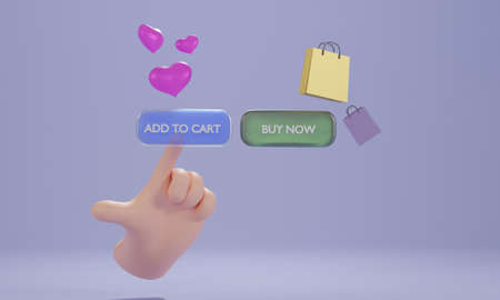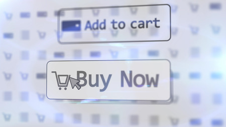 Impressive 3D rendering of a white internet shop screen with such inscriptions as add to cart, buy now, and one basket placed on two icons with numerous blurred drawings