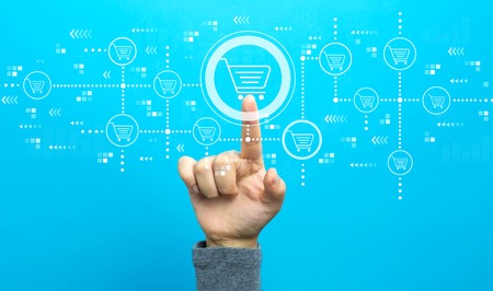Online shopping theme with hand on a blue background