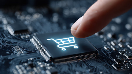 Digital Shopping Cart Icon on Circuit Board Representing E-commerce Technology and Online Retail Innovations in Modern Electronics