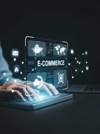 Hands typing on laptop with e-commerce hologram display