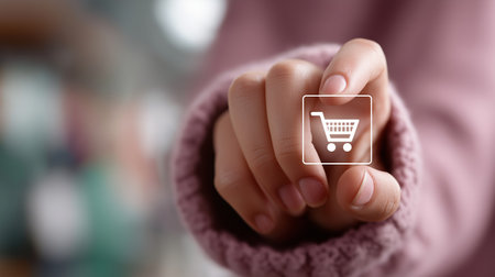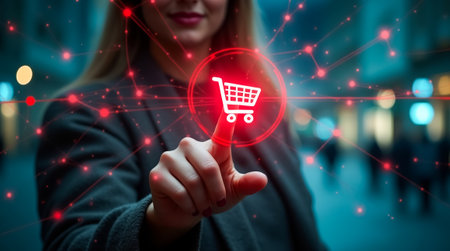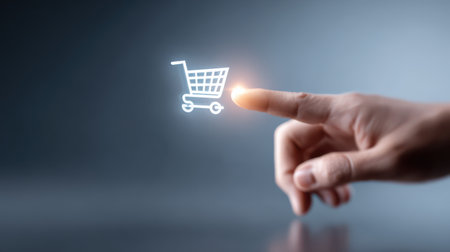 A hand reaches out, touching a glowing shopping cart icon, illustrating the ease of online shopping. The scene captures modern digital interactions.