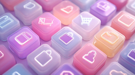 This macro image captures a laptop's buy now button, featuring glowing reflections of shopping cart icons. The vibrant colors enhance the digital shopping experience in stunning 8K detail.
