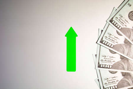 green up arrow near dollar bills. rate growth concept.