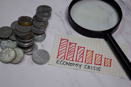 Economy Crisis and coins write on sticky notes isolated on office desk
