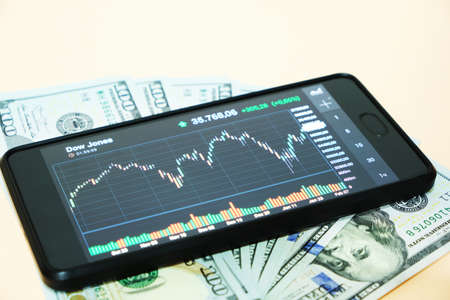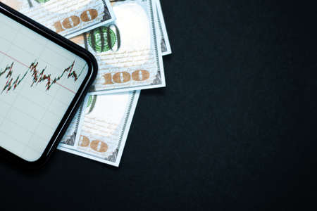 Stock exchange chart on smartphone screen and hundred dollar bills on beige background