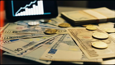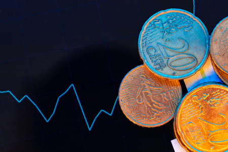 Euro cent coins on black background with graph