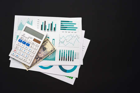 Business graphs paper and calculator on table