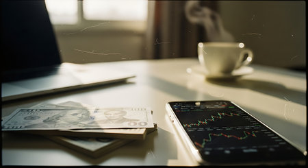 A smartphone displaying stock market data on a desk with cash and a cup of coffee