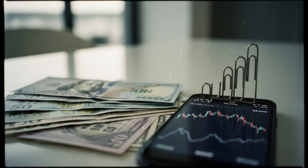 A stack of US dollar bills next to a smartphone displaying a stock chart with paperclips on top.