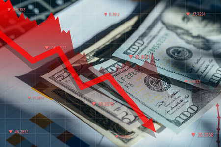 Falling graph on the background of dollars. US economy. Economic downturn in America. Decrease in business profits. Recession.