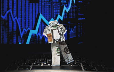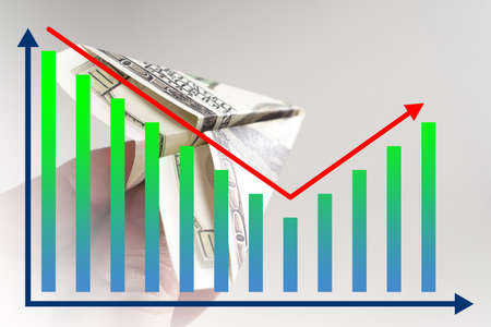 Airplane as a symbol of economic growth. Dollars in the hands of man. A plane made of dollars symbolizes a rebound. Revival of the financial sector. Rebound on the financial exchange. Graphic growth