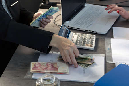 Cropped image of accountant writing something to computer and gives out cash money (ILS, shekels, dollars and pound sterling) to office worker. Female hands holding israeli shekels in the office