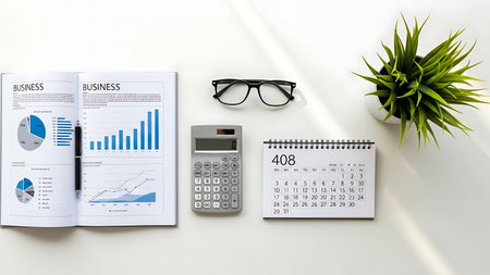A workspace features a calendar, calculator, and laptop, suggesting planning and scheduling. The scene includes a cup of coffee and scattered items, presented in an overhead composition. The lighting appears soft, indicating an indoor setting. This image is suitable for various commercial uses related to productivity and business.