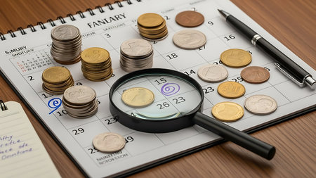A glass jar filled with various coins sits beside a calendar, illustrating the importance of financial planning, budgeting, and saving strategies for everyday life.