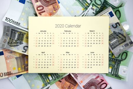 euro banknotes and coins on calendar 2020, concept of expenditure or taxes payment, cost in the new year.