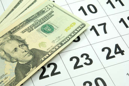 US currency money with five dollar banknote on the calendar. Business and finance concept.
