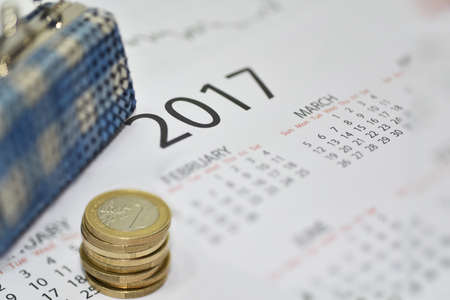 Planning and calculating some investment in Euro currency, European money and calendar page collage, Vacation money on the background of the calendar. Holiday planning. Euro banknotes