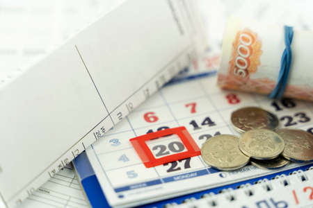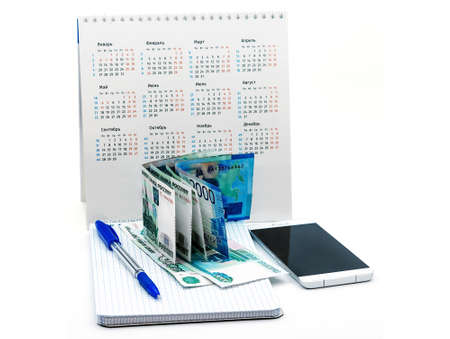 phone and money, Russian money and calendar, blue pen and Notepad on a white background,