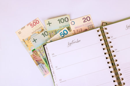 Polish Zloty cash banknotes sit alongside blank planner for organizing monthly finances budgeting tasks.