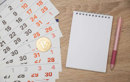 Paper Calendar with golden bitcoin and notebook on table. top view