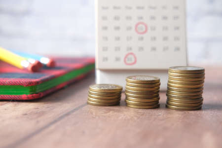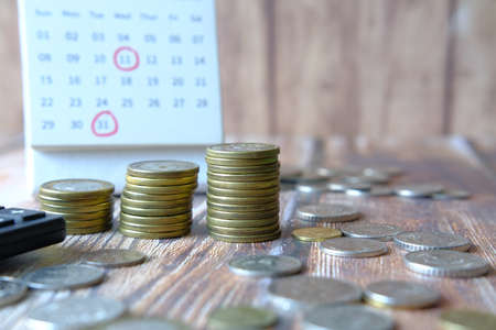 Pile of Thai baht coins on the calendar. Finance and Banking Concepts.