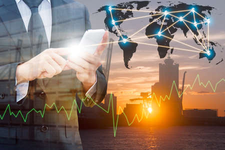 Double exposure of professional businessman using smart phone , city centre of business with blurred transportation port and distribution cargo warehouse background, Technology Transportation & Business trading concept