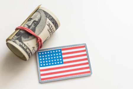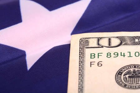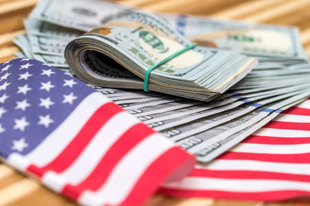 Close up of american flag and dollar cash money. Dollar banknote and United States flag on a background. Economy of USA