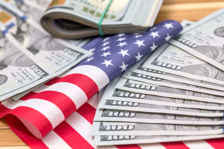 American flag and banknote USD currency money background. U.S. flag. United States of America flag and hundred-dollar bill.