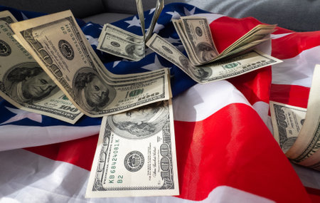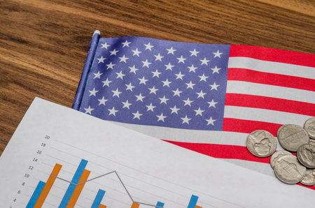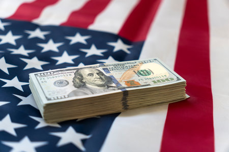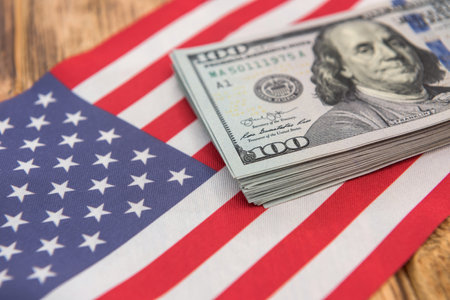 USA economic top view american flag on US dollars background